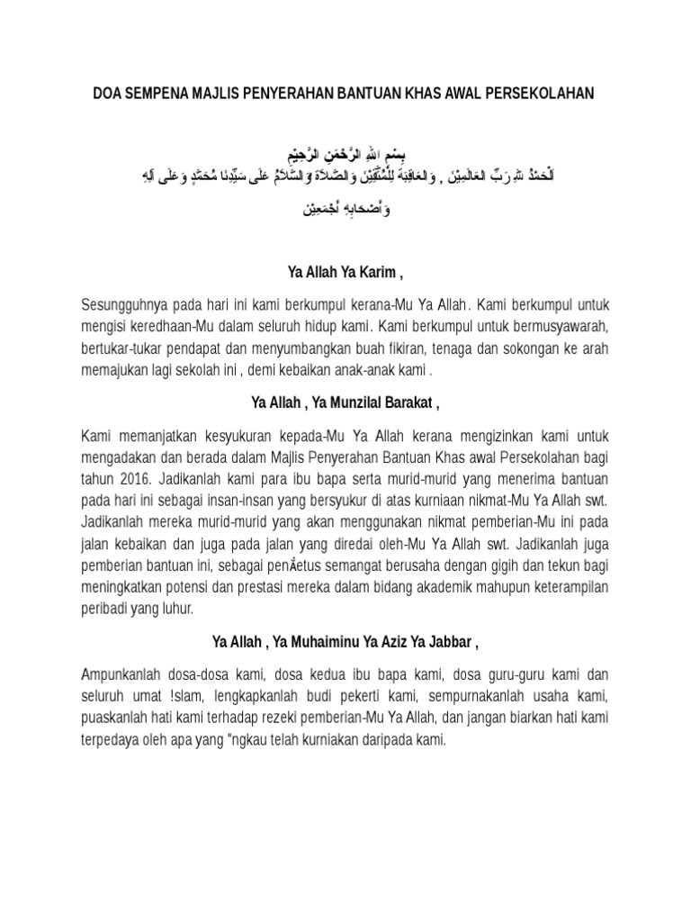 Doa Sempena Majlis Penyerahan Bantuan Khas Awal Persekolahan Pdf